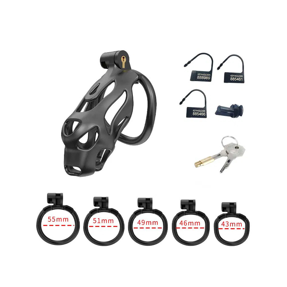 The opening at the front of each P-Cage allows the wearer to urinate without removing the cage. This penis cage set includes 5 rings in different sizes, ranging between 43 – 55 mm. In addition, it includes 1 copper built-in lock and 3 plastic numbered padlocks.