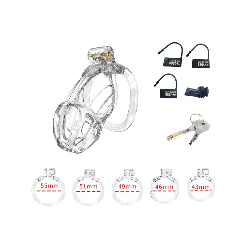 The opening at the front of each P-Cage allows the wearer to urinate without removing the cage. This penis cage set includes 5 rings in different sizes, ranging between 43 – 55 mm. In addition, it includes 1 copper built-in lock and 3 plastic numbered padlocks. The plastic locks can be cut off with scissors after a single use. Finally, one plastic screw is included as an alternative to the copper built-in lock, which may not pass airport security checks, while the plastic lock is airport-friendly.