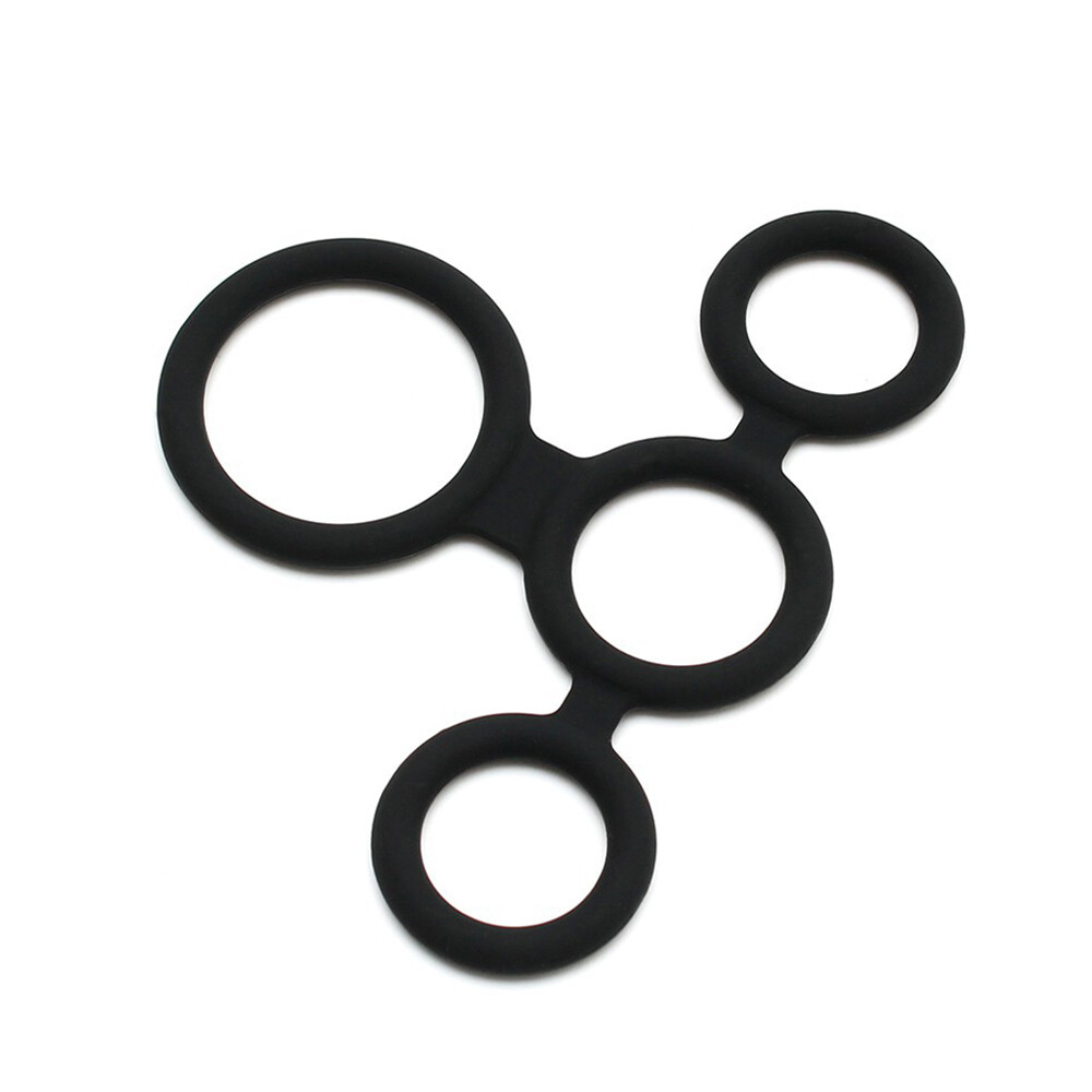 This cockring has four rings that are attached to each other, one with a diameter of 4 cm, one with a diameter of 2.5 cm and two with a diameter of 2 cm. The largest ring 4 cm needs to be worn around the scrotum. The second ring 2.5 cm should be worn around the shaft. The two smaller rings both 2 cm should be placed around one testicle each, splitting the balls.
